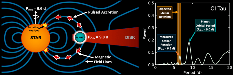 In Biddle et al. (2018), I present the first detection of planet-driven pulsed accretion onto a star, introducing a unique method for finding close-in planets around young stars with protoplanetary disks. The basis of such a detection relies on the interaction between a close-in planet and accreting disk material. As the planet moves through the disk, it will cause density perturbations in nearby disk material, altering the rate of accretion onto the star. The resulting brightness of the hot spot at the base of the accretion stream will vary periodically on the timescale of the planet’s orbit.